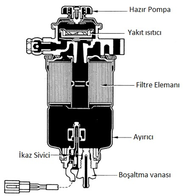 - Su ayırıcı, dizel yanacağı ilə suyun xüsusi çəkilərinin fərqli olması xüsusiyyətindən istifadə edərək suyu yanacaqdan ayıran bir mexanizmdir. Su ayırıcının aşağı hissəsində boşaltma klapanı mövcuddur. Klapan açılaraq və mexaniki nasos işlədilərək toplanmış su kənarlaşdırılır.